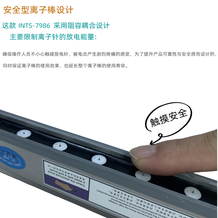 产品介绍 离子棒是铝合金外壳,其最大特点是安全型,棒体表面和触摸放电针不会电人,需不需要压缩空气都可以正常使用,其设计特别适合于广泛用于电子行业、LED光电、半导体、小零件加工、医药制造、印刷、纺织`包装、塑胶喷涂,锂电隔膜,玻璃纤维膜,薄片料加工、分切、PVP.卷料等平面场合消除静电。消除静电距离最好为10-500mm,长度可以根据客户的要求订做,需配用SM-008高压电源供应器才可以使用。 安全型离子棒 这款TS-7986 采用阻容耦合设计,主要限制离子针的放电能量,确保操作人员不小心触碰放电针,被电击产生剧烈疼痛的感觉,为了提升产品可靠性与安全感而设计的,同时保证离子棒的使用效果,也延长整个离子棒的使用寿命。