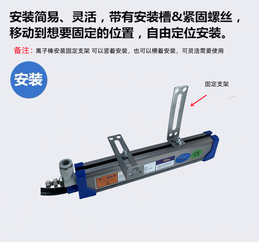 使用方法 除静电棒需配电源供应器一起使用,将除静电棒连接线末端插入电源供应器输出插孔,然后将电源供应器的插头插入带有接地线的插座上(注意电源供应器的使用电压),将除静电棒固定安装到合适的位置。加入 压缩空气,除静电棒打开电源供应器电源后,开机后,对着需要除静电的产品,产品从离子棒下方经过就可以除静电除尘。如单除静就不需要压缩空气但不用压缩空气的除静电棒安装位置与需要离除静电的地方保持在20-100MM之间,打开电源供应器电源后,将有离子针的一面对着需要除静电的地方,只要产品从下面过就可以消除静电了.