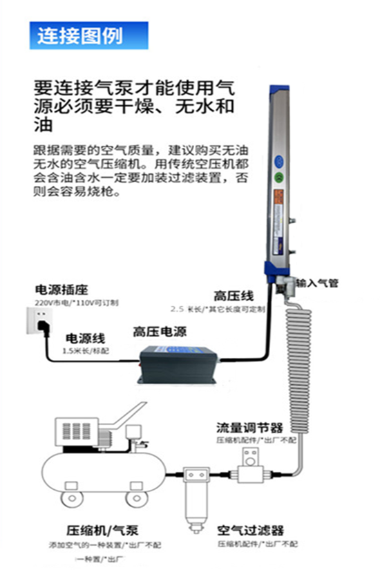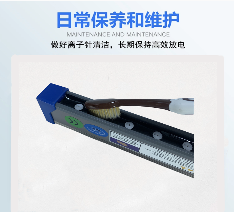 使用方法 除静电棒需配电源供应器一起使用,将除静电棒连接线末端插入电源供应器输出插孔,然后将电源供应器的插头插入带有接地线的插座上(注意电源供应器的使用电压),将除静电棒固定安装到合适的位置。加入 压缩空气,除静电棒打开电源供应器电源后,开机后,对着需要除静电的产品,产品从离子棒下方经过就可以除静电除尘。如单除静就不需要压缩空气但不用压缩空气的除静电棒安装位置与需要离除静电的地方保持在20-100MM之间,打开电源供应器电源后,将有离子针的一面对着需要除静电的地方,只要产品从下面过就可以消除静电了.