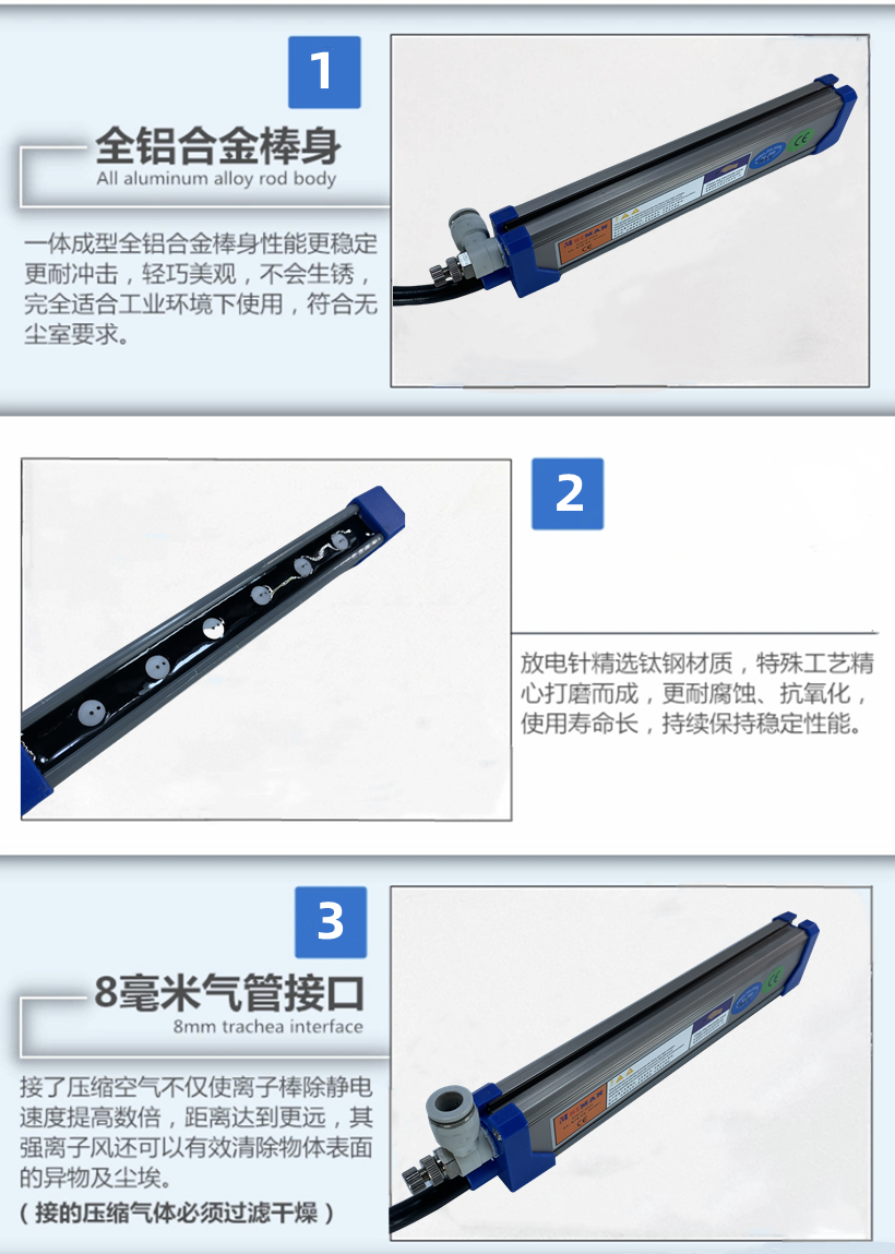 离子棒是铝合金外壳,其最大特点是安全型,棒体表面和触摸放电针不会电人,需不需要压缩空气都可以正常使用,其设计特别适合于广泛用于电子行业、LED光电、半导体、小零件加工、医药制造、印刷、纺织`包装、塑胶喷涂,锂电隔膜,玻璃纤维膜,薄片料加工、分切、PVP.卷料等平面场合消除静电。消除静电距离最好为10-500mm,长度可以根据客户的要求订做,需配用SM-008高压电源供应器才可以使用。