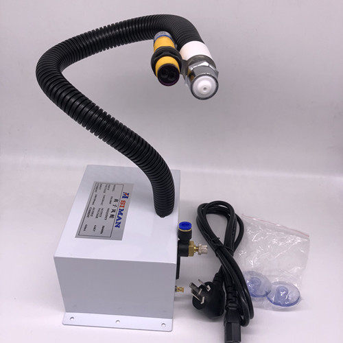 产品介绍 TS-080F感应式连体离子风蛇内置变压器,不用另配电源供应器,风蛇前面安装了光电感应开关,当物体经过感应头前面时,TS-080F感应式连体离子风蛇自动吹出离子风,可节约压缩空气,适合放在工作台或安装于机器设备上使用,可将蛇管随意变形使风蛇指向目标方位,无需用手操作可让离子气流直接吹向目标表面,需要配压缩空气才可使用。 产品特点 ◆除静电和除尘二合一 ◆安装了光电感应开关控制气流 ◆蛇管可随意变形使风咀指向目标方向, ◆无需用手操作可让离子气流直接吹向目标表面 ◆内置变压器,不用另配电源供应器。 主要用途 TS-080F感应式连体离子风蛇已内置电源,不用另配电源供应器。用于消除静电、清除灰尘。解决静电对电子产品的破坏,静电引起的吸尘问题,静电引起的产品粘合问题等。TS-080F感应式连体离子风蛇广泛用于塑胶喷涂、电子行业、LED光电、印刷、包装、塑料薄膜的剪切,圆圈和覆膜等等。 技术参数 工作电压 4.6KV 功 率 25W 重 量 3kg 蛇管长度 45CM 电源线长 1.8M 操作温度 -10°C ~ 50°C 压缩空气压力 40~70psi 除静电时间 <0.6s TS-080F感应式连体离子风蛇已内置电源直接插220V电源就可使用,电源供应器将220V输入电压升到4.6KV,然后通过高压电线连接到离子风蛇头部的离子针上,离子针和离子风蛇头部之间产生强电场, 通过尖端高压电晕放电把空气分子电离, 离子针尖端产生大量正负离子。然后通过压缩空气把离子吹到带电物体的表面, 当带电物体表面为正电位时, 负离子将其中和, 反之, 如果表面为负电位, 正离子将其中和,达到消除静电的目的,同时高速的压缩空气还可将物体上的灰尘吹走。 TS-080F感应式连体离子风蛇需接上压缩空气才能使用。感应式连体离子风蛇电源线连接到有接地的电源插座上,然后把气管插到离子风蛇气管接口上,打开电源开关和压缩空气就可以使用了,对着需要除静电除灰尘的地方吹,就可以消除静电和灰尘。 本公司严格遵守:产品质量第一,信誉第一,客户至上的宗旨,离子风蛇实行以下承诺 1.保用期 凡本公司出售的离子风蛇保用期为1年,自出售日起1年内因产品自身机件、材料及工艺问题造成的质量问题,本公司免费修理。 2.保用期后 凡本公司出售的离子风蛇保用期过后仍负责对产品的免人工费修理,以保证客户的利益。